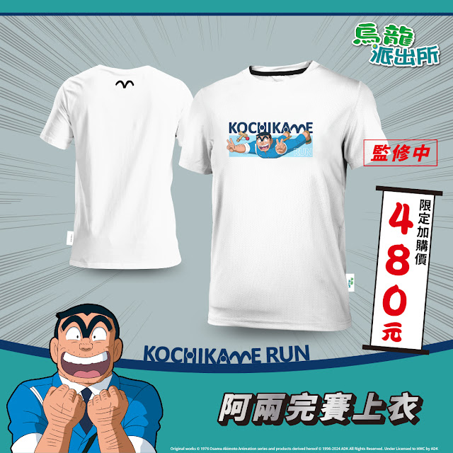 大家最喜愛的阿兩週邊來啦!本次活動組別共有兩組,分成980元的「龜有派出所組」、1980元的「警察出動組」兩種組合供粉絲選擇,週邊限定物資分別有「造甘那盃運動上衣」、「兩津棒球帽」、「龜有走透透隨身側背包」、「兩津抱枕」、「烏龍派出所保溫杯」、「烏龍派出所大浴巾」,眾多精美又實用的烏龍派出所限定週邊,只要報名通通都能打包帶回家,並且會於活動前寄送到府,粉絲們快來收藏!另外還有路跑必備的T恤、完賽證明、完賽獎牌、完賽禮。不論是哪個商品組合,組合中都會有一張烏龍派出所路跑的號碼布,可領取完賽禮、完賽獎牌、完賽證明。紀念獎牌更是兩津勘吉元氣滿滿的模樣,紀錄粉絲完賽的雀躍心情。